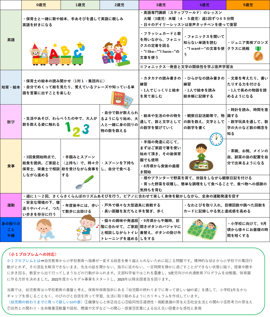 当園が掲げる保育目標は「小学校へあがったときキラキラと輝ける子供」に育てる事です。それには生きる力の基礎となる自立・集団行動・自己発信能力の他に読み・書き・計算など、小学校へあがったときに自信を持ってやっていけるように指導していきます。ご父兄の一番心配している「保育園育ちは習い事をさせれない」を十分補い、小学校へ送り出します。